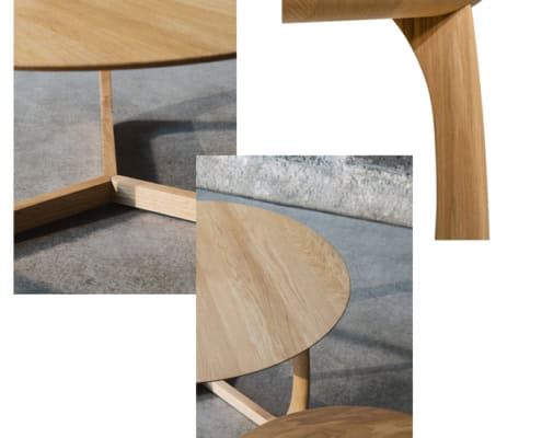 Runde loungeborde, som fås i tre størrelser. Bordene er fremstillet i massiv eg.