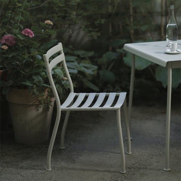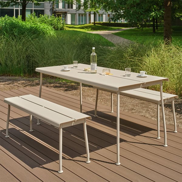 Fremstillet i galvaniseret stål. Serien omfatter stole, borde og en bænk, samt hynder.