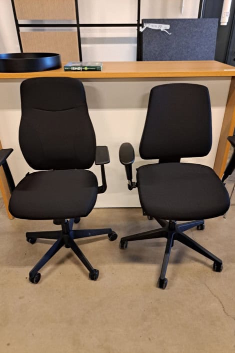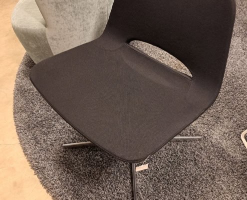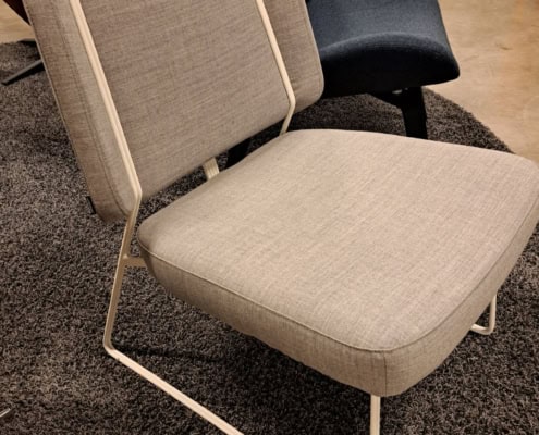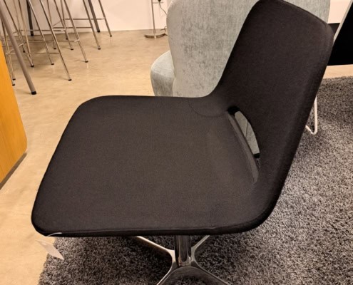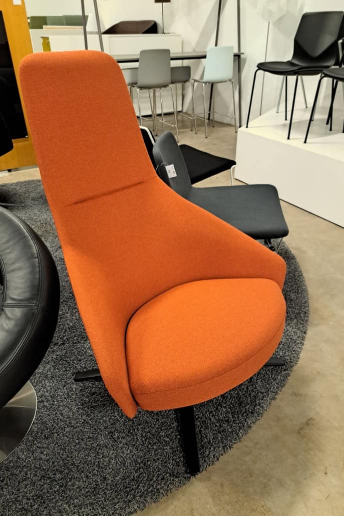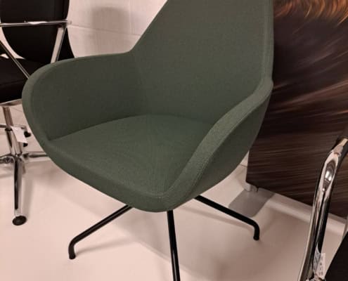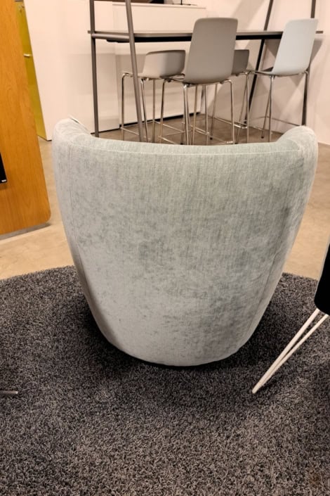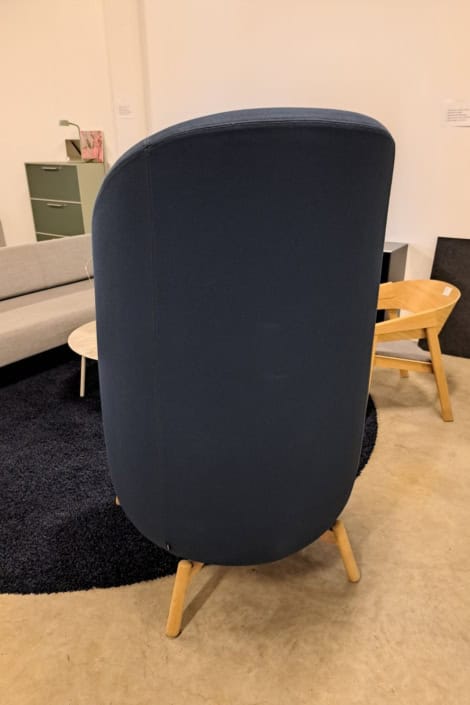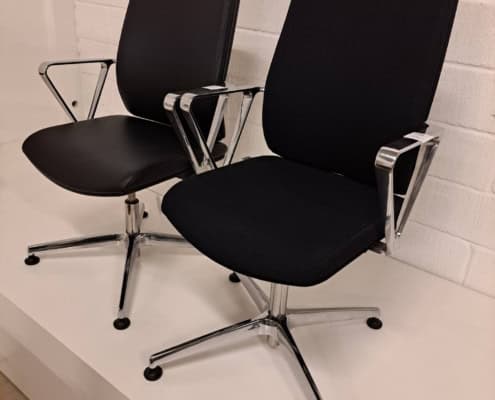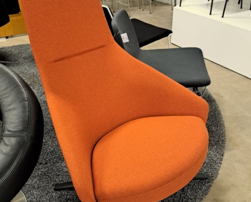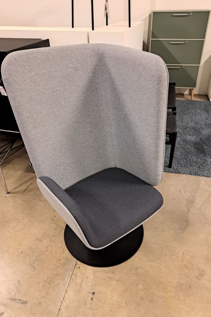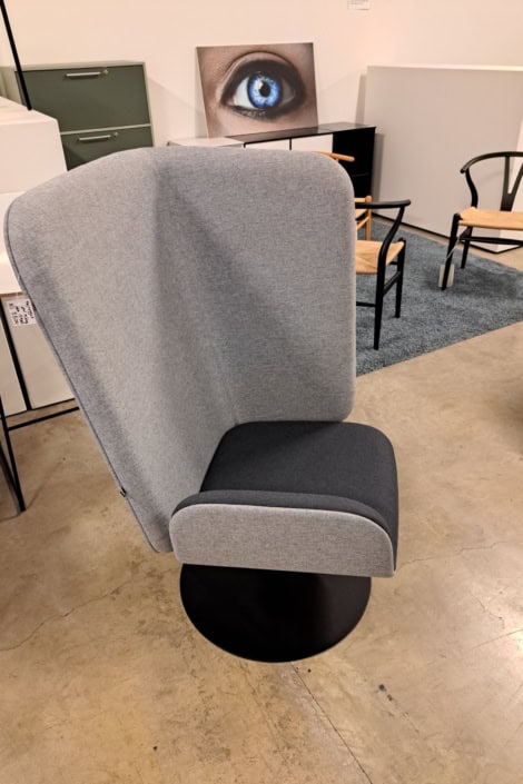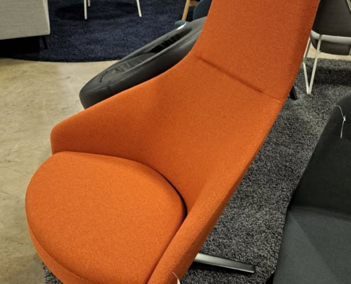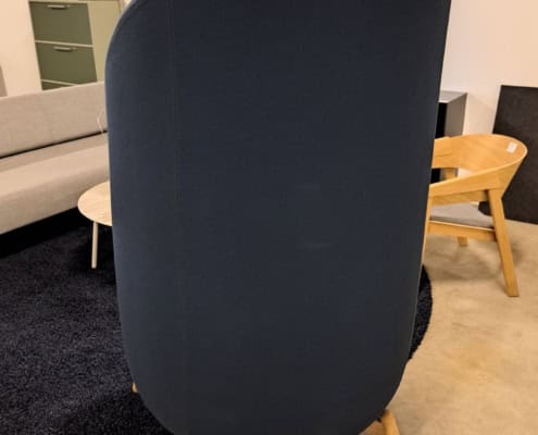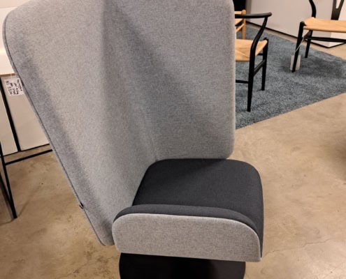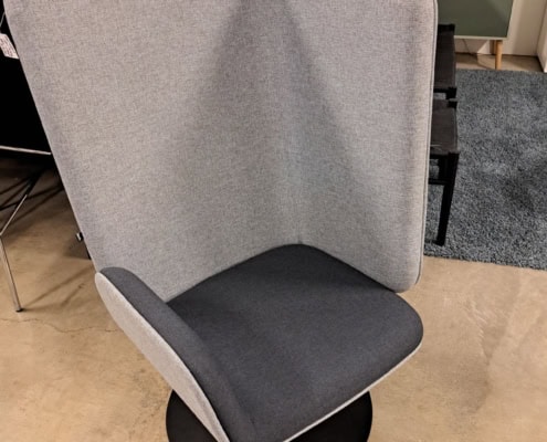 samme billede viser højrygget akustik drejestol, som også har vip i sædet.