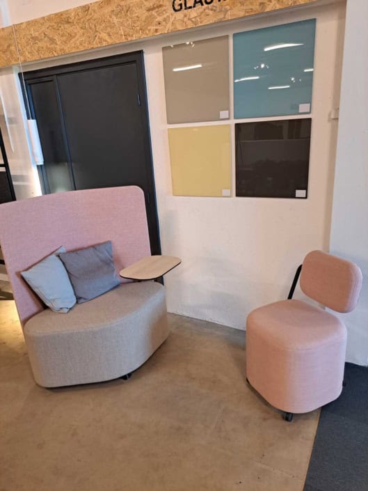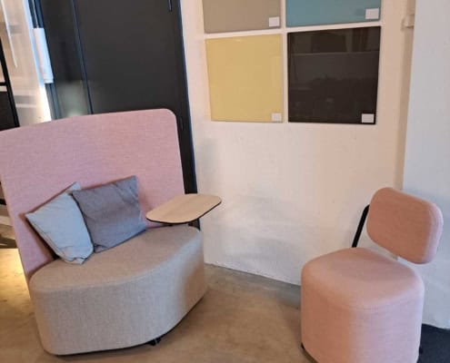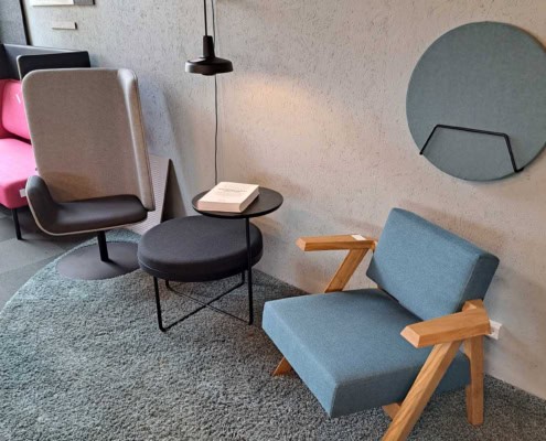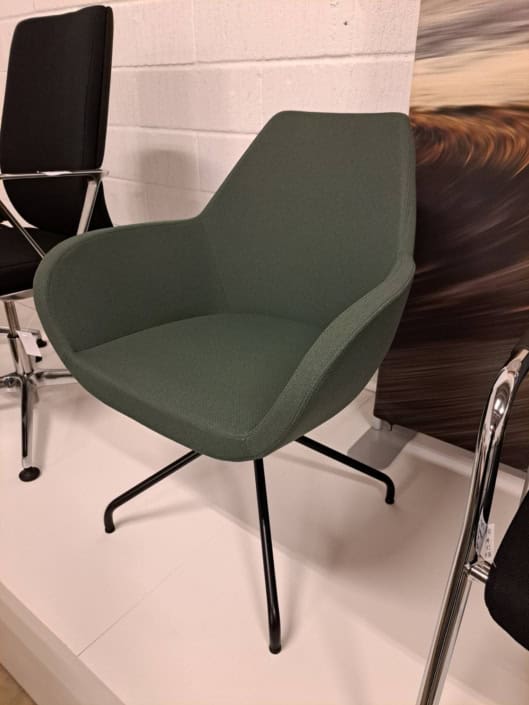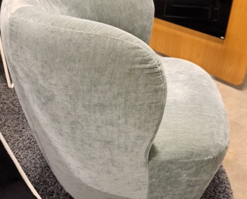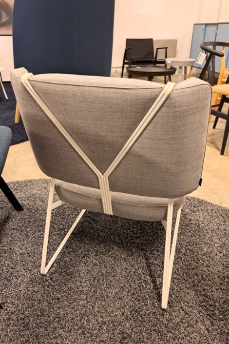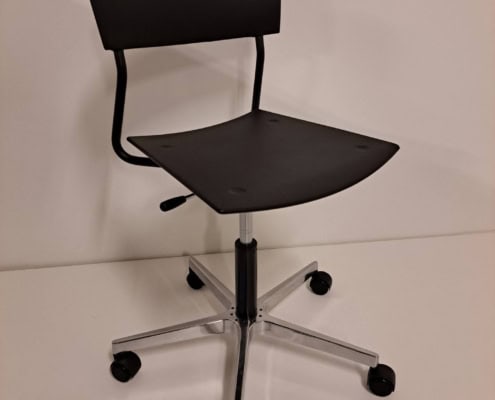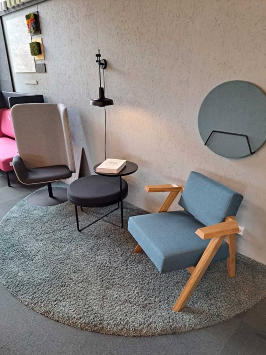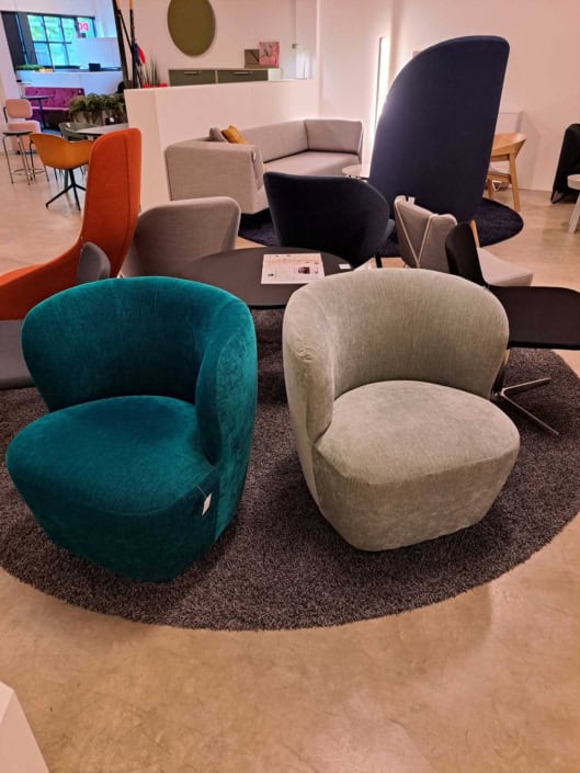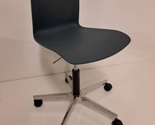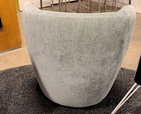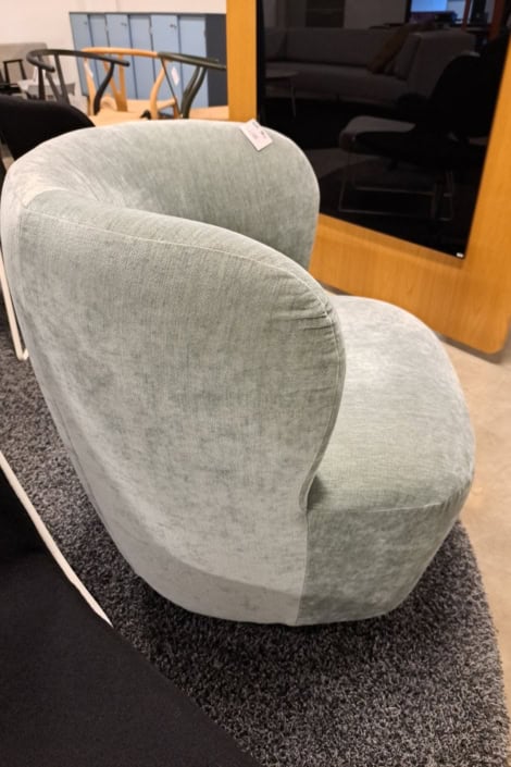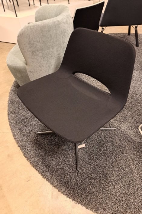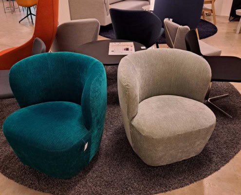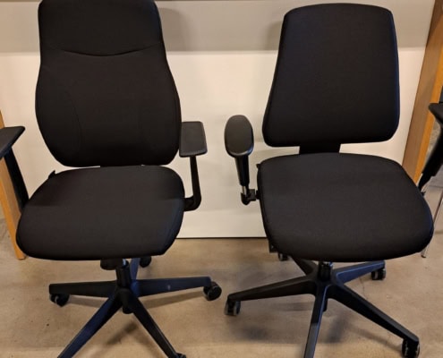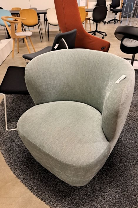 samme billede viser højrygget akustik drejestol, som også har vip i sædet.