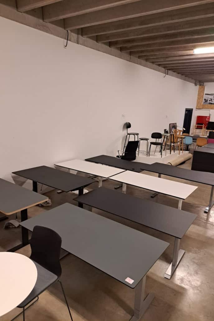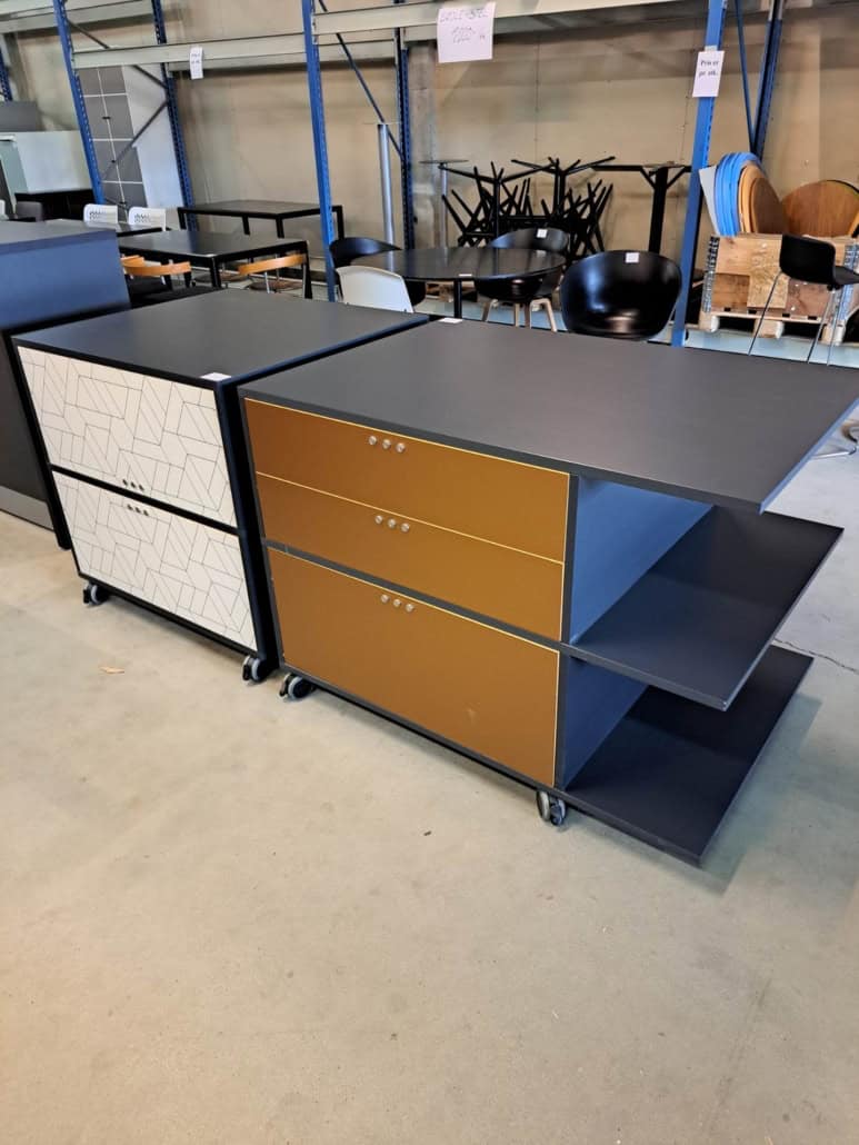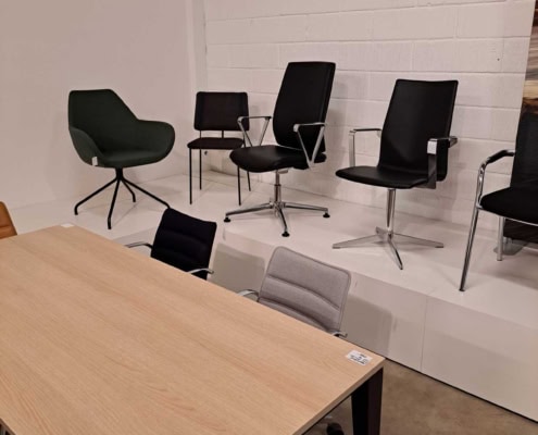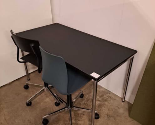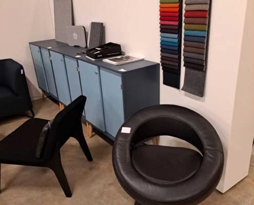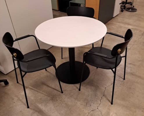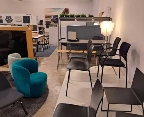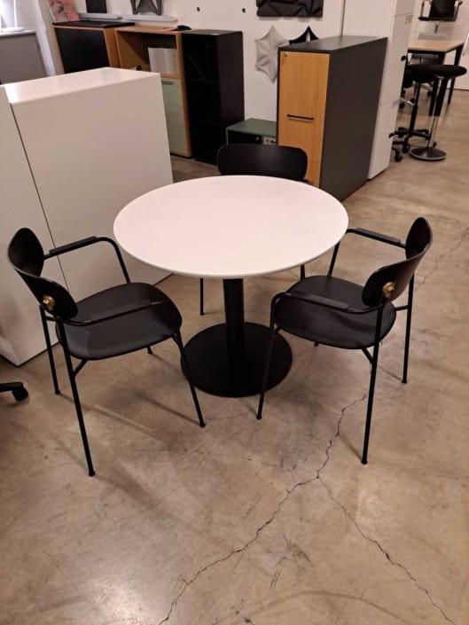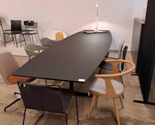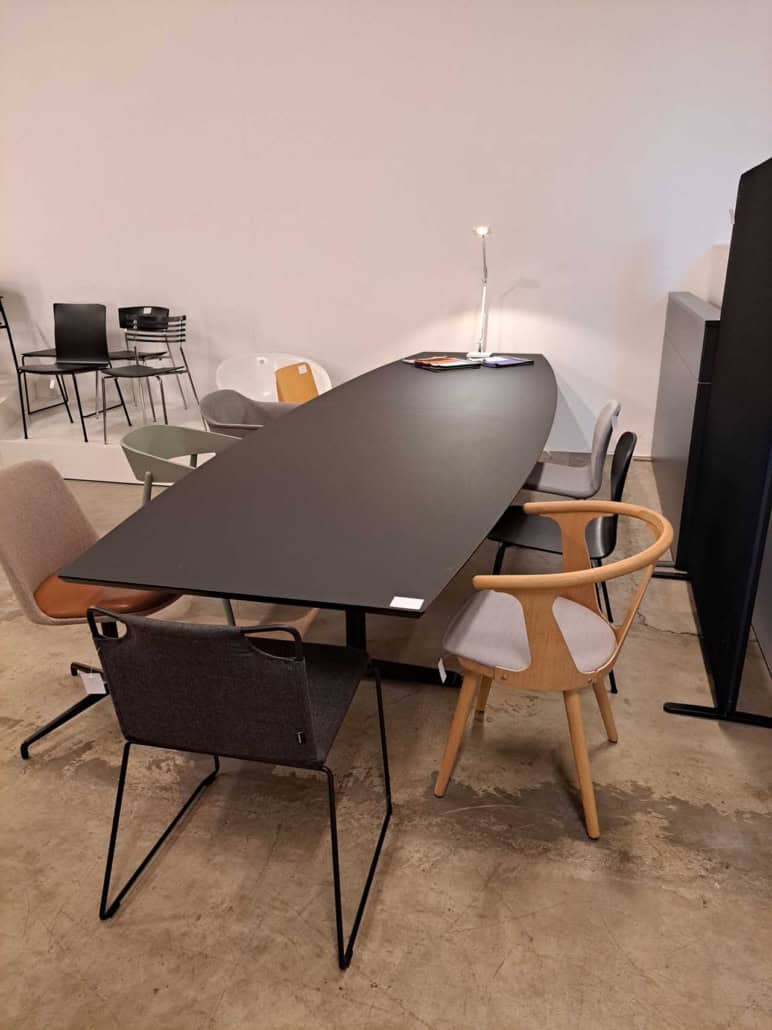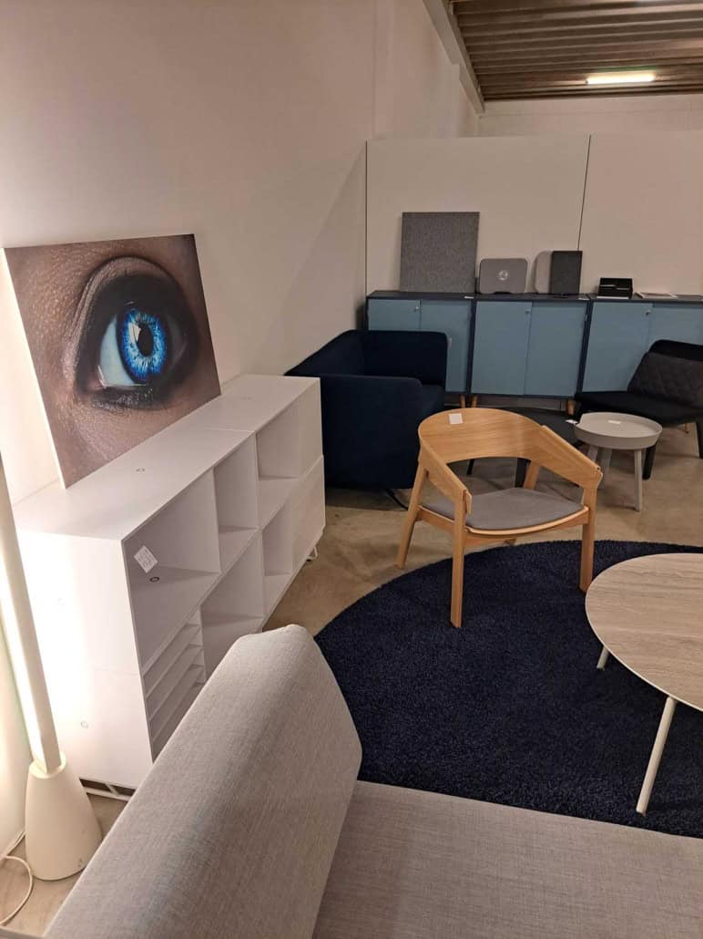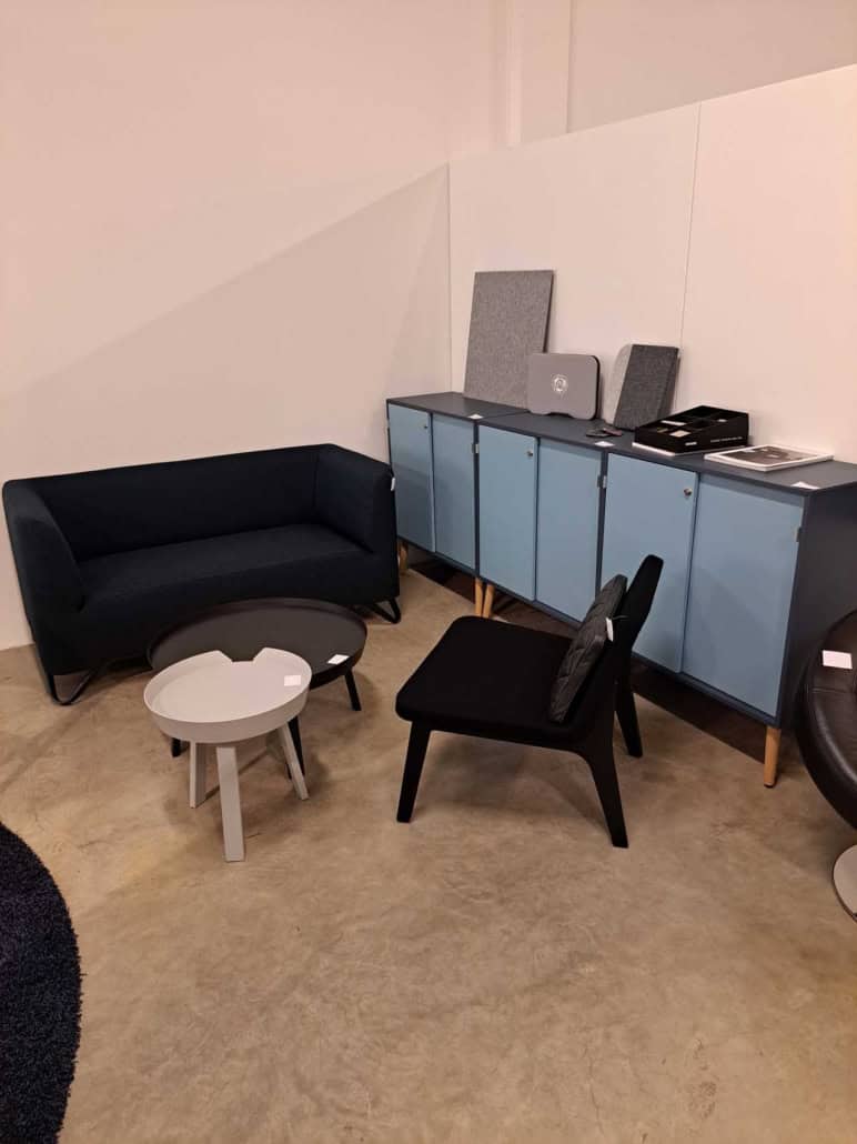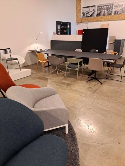 Demo Kontorskabe = 400,- | Demo Gubi Stay lounge Chair = 2000,- | Demo 12 prs. Mødebord Sort linoleum 2500,-