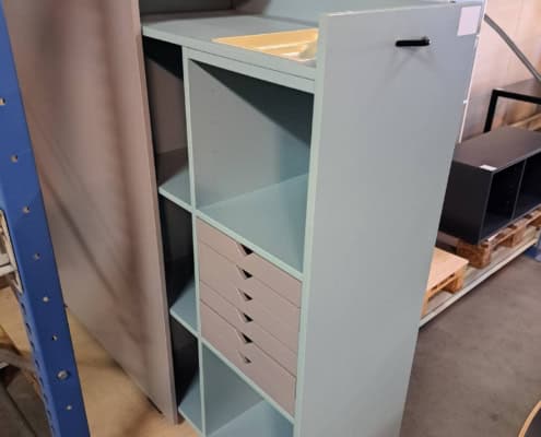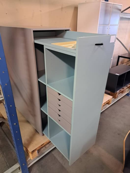 Blåt udtræksskab, 2 stk. pris er pr. stk. Højre og venstrevendt, B41 x D90 x H121 cm.