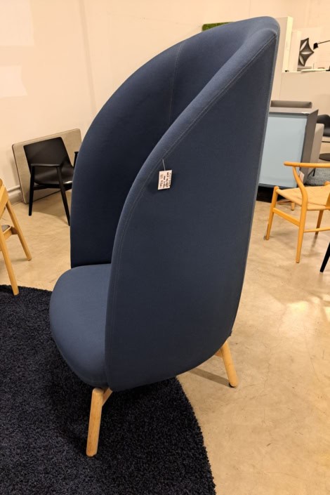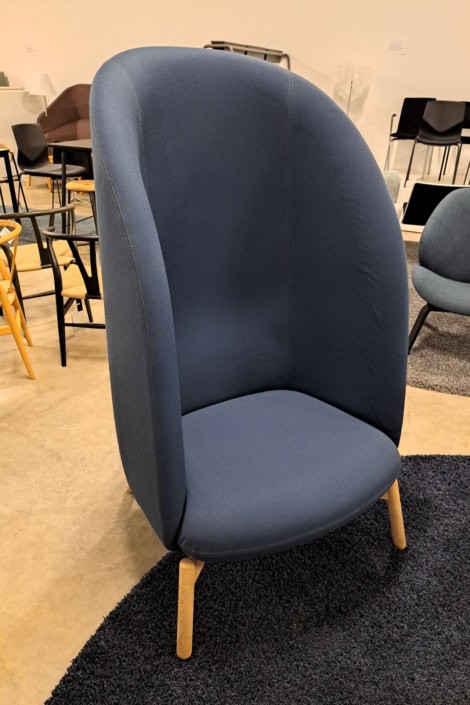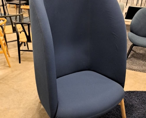 NEST Højrygget loungestol, fra PLUS HALLE med egestel og blåt tekstil